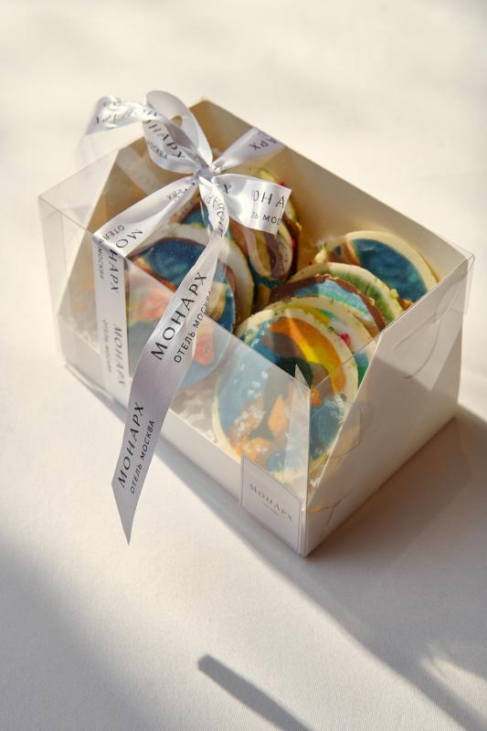Шоколад передает тепло и удовольствие, а образы океана символизируют безграничные возможности и стремление к новым открытиям. Изысканное лакомство представлено в наборе из премиального бельгийского белого и молочного шоколада с фисташками и сублимированной малиной, изюмом, вымоченным в роме и вафельной крошкой.