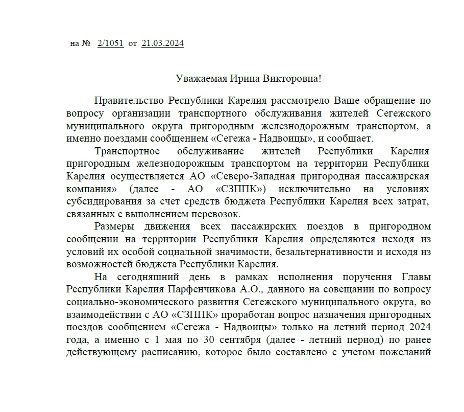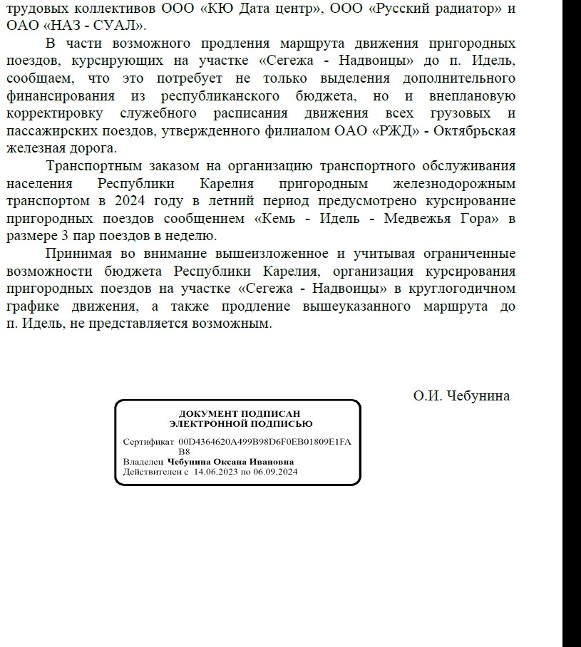 — Учитывая ограниченные возможности бюджета Республики Карелия, — писала в официальном ответе в 2024 году премьер-министр Правительства Карелии по развитию инфраструктуры Оксана Чебунина. — Организация курсирования поездов на участке «Сегежа-Надвоицы» в круглогодичном графике движения, а также продление… маршрута до п. Идель не представляется возможным.