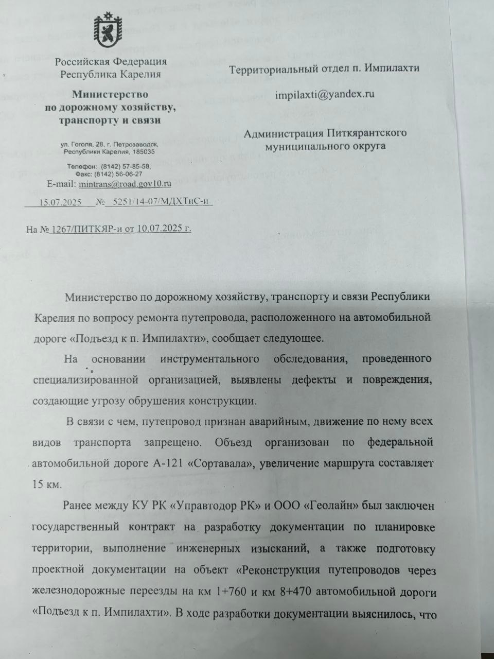 — Учитывая вышеизложенное, было принято решение о расторжении контракта ввиду невозможности проектирования в пределах Минтрансом изыскиваются возможности для реализации комплекса мероприятий по восстановлению несущей способности указанного путепровода. Сроки восстановления в настоящее время не определены, — оставили людей без конкретного ответа в Минтранспорта Карелии.