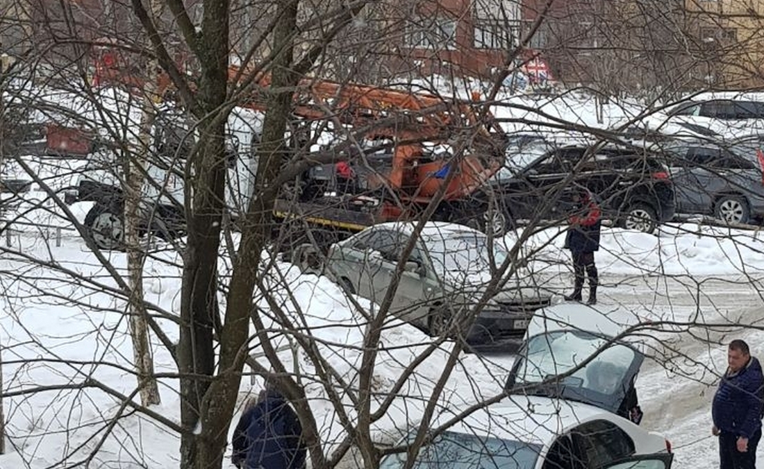 Автовышка снесла неудачно припаркованный автомобиль во дворе Петрозаводска