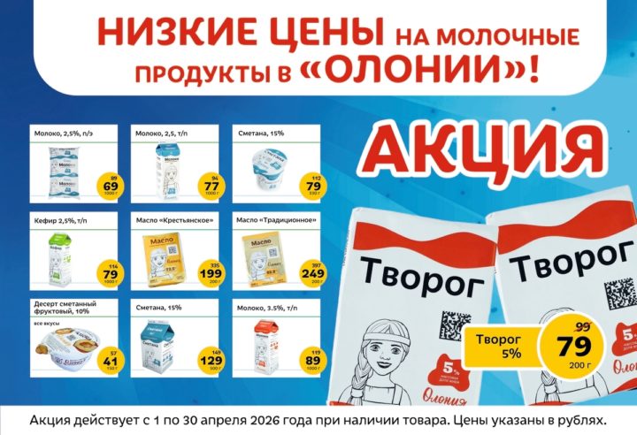 Торговая сеть «Олония» третий месяц удерживает низкие цены на самые востребованные среди покупателей молочные продукты местного производства. Речь идет про молоко, сметану, творог 5%, кефир, масло и полезные сметанно-фруктовые десерты, которые производит Олонецкий молочный комбинат.