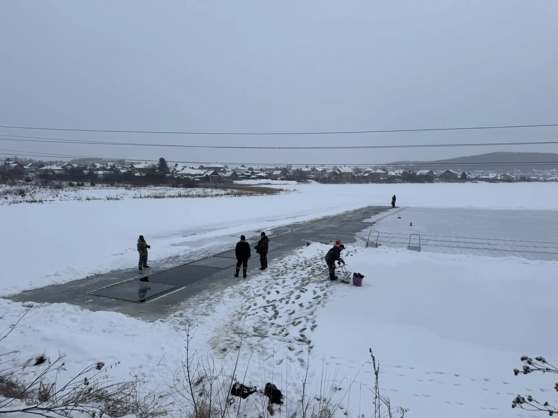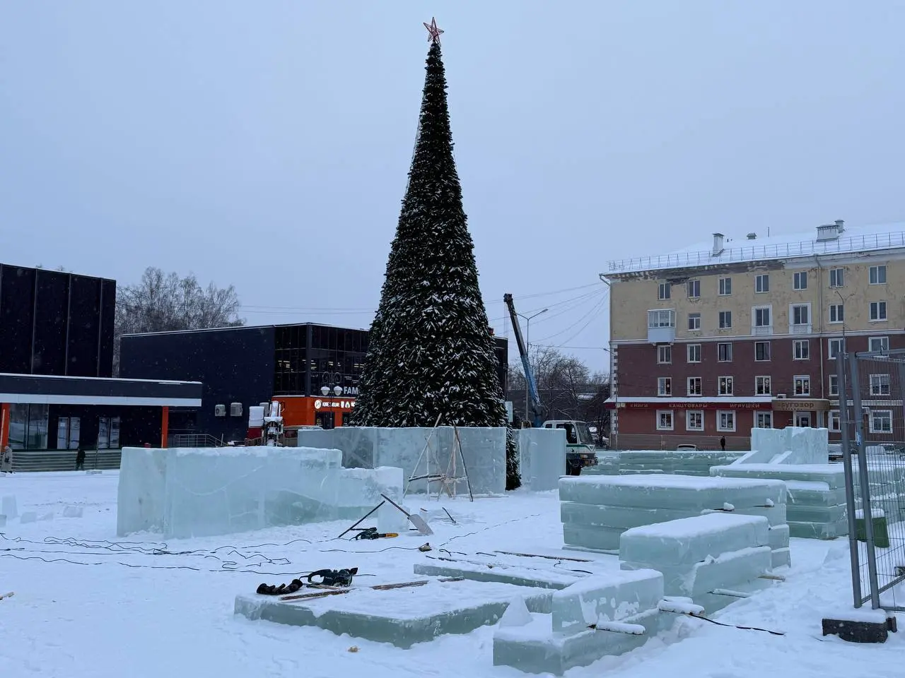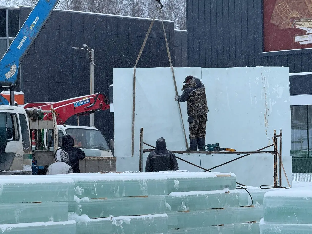 Лед для фигур заготовили всего за день — 13 декабря техника и бригады отправились на Глубокую, где толщина покрова к этому дню уже достигла 20 сантиметров. Рабочие нарезали массивные блоки и сразу увезли их на площадь.