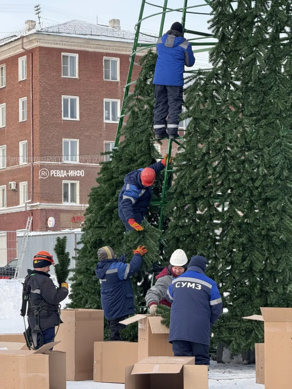 На площади полным ходом идет строительство новогоднего городка. В этом году к организации праздника подключился СУМЗ: первоначальный контракт с ИП Макаровым на возведение ледяного городка по каким-то причинам расторгли. Рабочие уже установили и частично украсили главную елку —на макушке красуется звезда, и висят гирлянды.