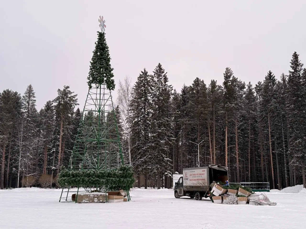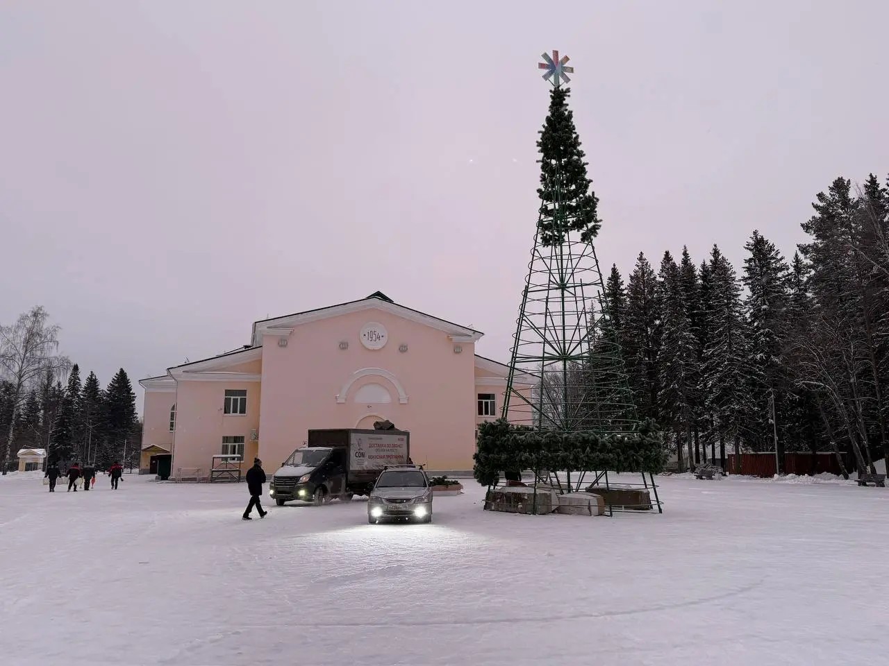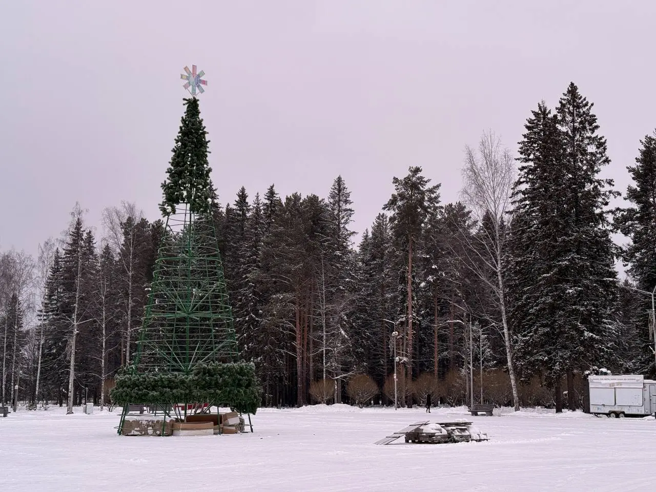 Тем временем в парке ДК устанавливают новогоднюю елку со световым шатром по контракту с мэрией, работает Дмитрий Востриков за 689 тысяч рублей из бюджета города. В рамках контракта также поставят световые скульптуры на площади Победы.