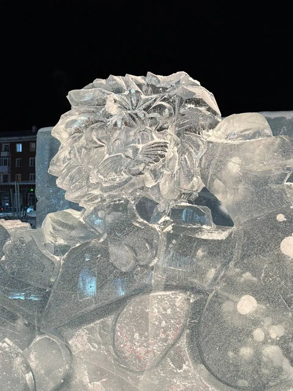 15 декабря скульпторы приступили к созданию ледяных композиций. Уже к полудню виднелись контуры двух маленьких горок, а к вечеру из глыбы возник узнаваемый герой — львенок из советского мультфильма «Как львенок и черепаха пели песню». В тот же день завершили и ледяное ограждение вокруг елки.