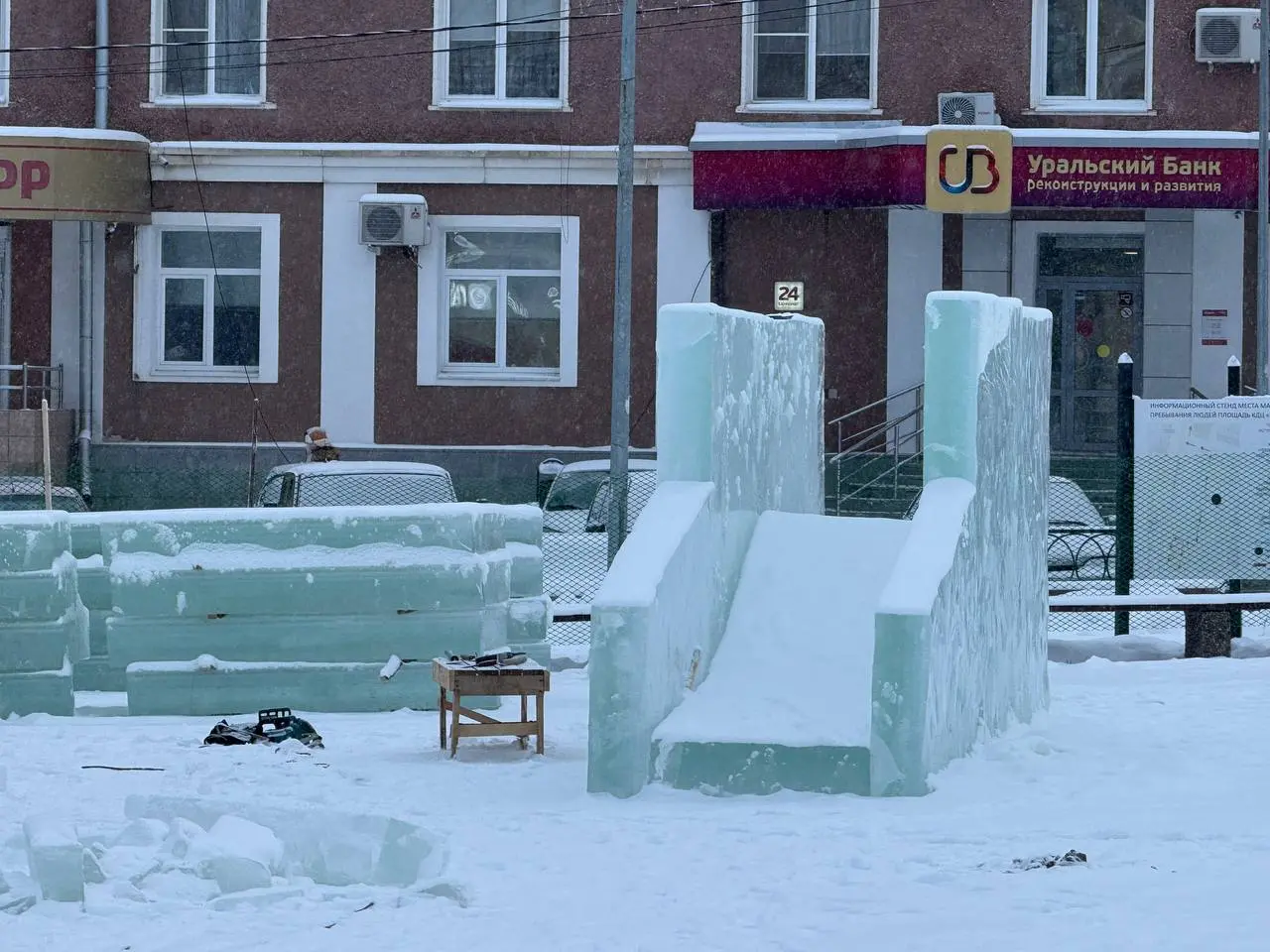 Тема городка в этом году — советские мультфильмы, поэтому гостей ждут и другие любимые образы. Там будут скульптуры Деда Мороза, Снегурочки и персонажей из мультфильмов. Обещают три горки, лабиринт, ледяную чашу. Работы идут по графику, и, судя по темпу, мастера уложатся в срок.