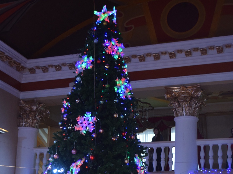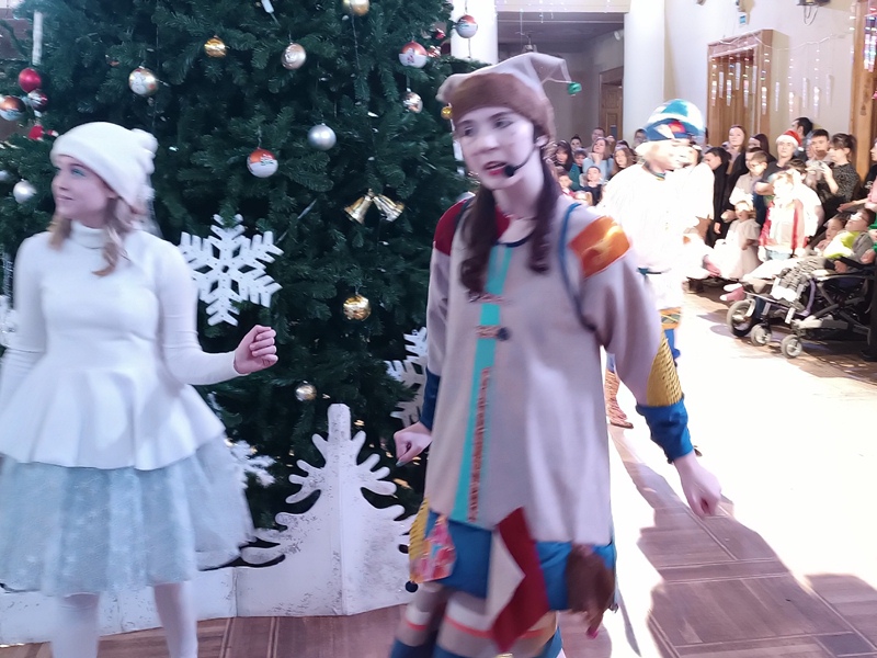 Представление началось в холле театра с забавных игр, фотосессии и традиционного хоровода вокруг елки.