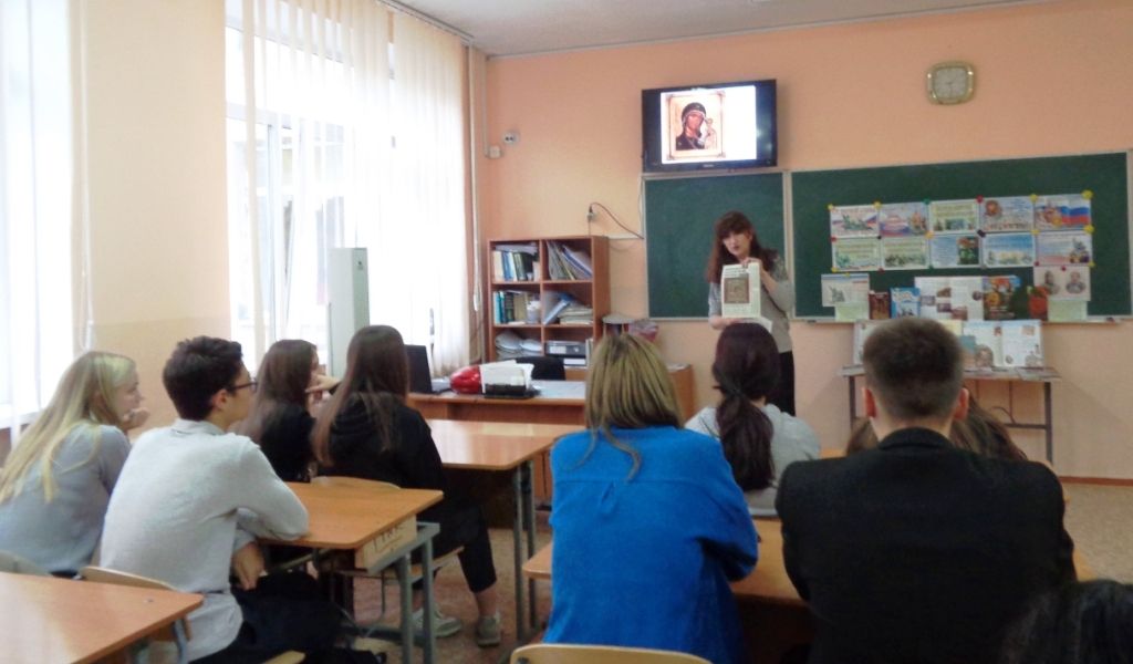 Организаторы мероприятия рассказали присутствующим о том, что этот знаменательный день был учрежден в память о событиях 1612 года, когда народное ополчение под предводительством Кузьмы Минина и Дмитрия Пожарского освободило Москву от польских интервентов. Исторически этот праздник связан с окончанием Смутного времени в России в XVII веке. Под знамена Пожарского и Минина собралось огромное по тому времени войско – более 10 тысяч служилых поместных людей, до трех тысяч казаков, более тысячи человек стрельцов и множество людей из крестьян. Просмотрев видео-презентацию «Под звон колоколов единство обрели», ребята с интересом узнали, что с чудотворной иконой Казанской Божией Матери, явленной в 1579 году, Нижегородское ополчение сумело 4 ноября 1612 года взять штурмом Китай-город и изгнать поляков из Москвы. Эта победа послужила мощным импульсом для возрождения российского государства, а икона стала предметом особого почитания.