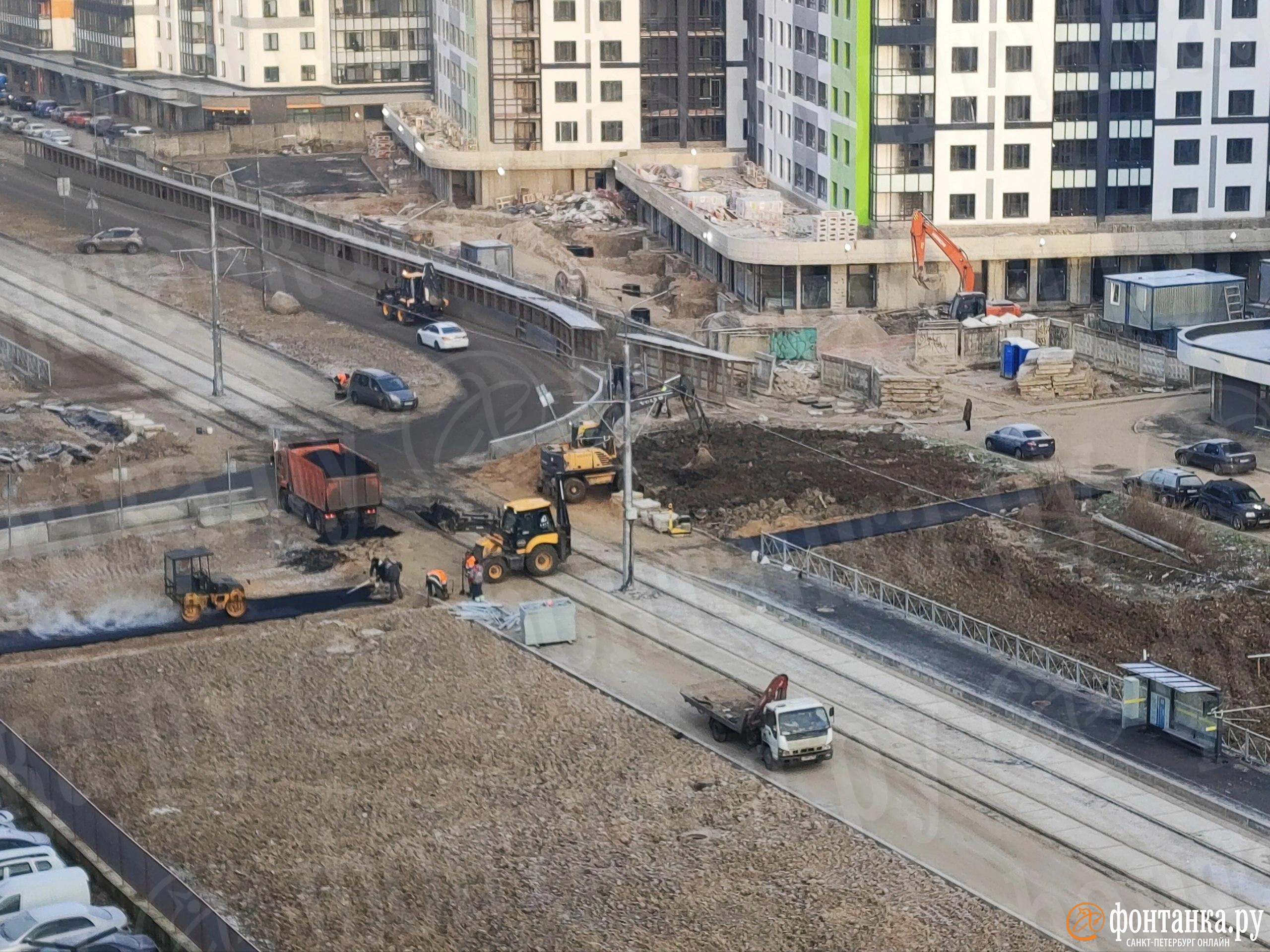 Также началось асфальтирование путей к остановкам через будущий проспект.